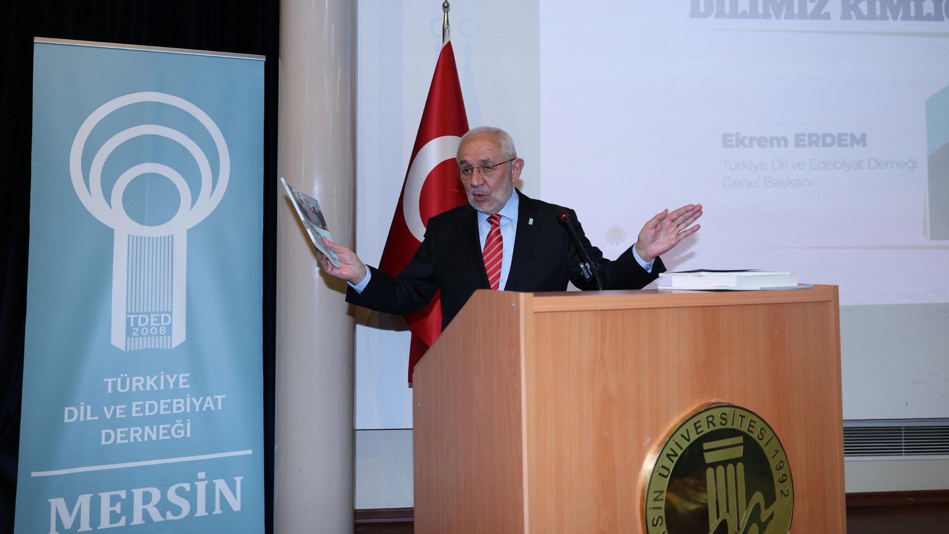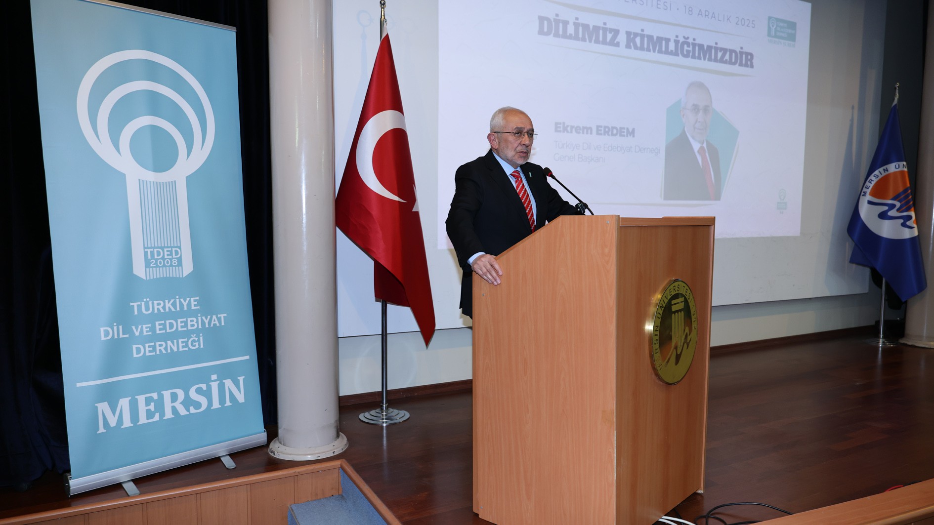 Türkiye Dil ve Edebiyat Derneği Mersin Şubesi ile Uluslararası İlişkiler Bölümü ve Medeniyet Okumaları Topluluğumuz iş birliğinde, Türkiye Dil ve Edebiyat Derneği Genel Başkanı Ekrem Erdem’in konuşmacı olduğu “Dilimiz Kimliğimizdir” adlı konferans, 18 Aralık Perşembe günü Üniversitemiz Prof. Dr. Uğur Oral Kültür Merkezi’nde gerçekleştirildi.