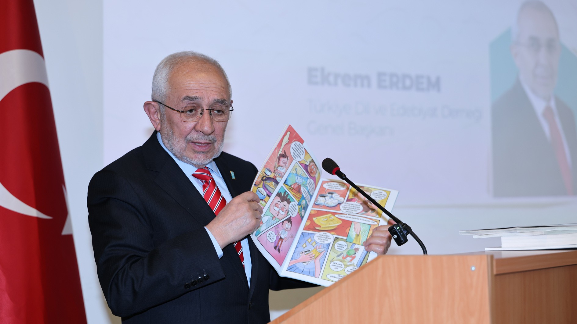 Türkiye’de tabelalar ve yön levhalarına standart kazandırılması ile bilişim ve internet dilinin Türkçeleştirilmesine yönelik yürüttükleri çalışmalara değinen Ekrem Erdem, internetle birlikte yabancı kelime kullanımının arttığını ifade ederek, “Yaklaşık 16 milyon kilometrekarelik bir coğrafyada, yaklaşık 250 milyon konuşuruyla dünyanın en büyük dilleri arasında yer alan Türkçe; bugün bilim ve teknolojideki hızlı gelişme, basın ve yayın kuruluşlarının kullandığı özensiz dil, ticari hayatın getirdiği yabancı kelime kullanım alışkanlığı, yabancı dilde eğitim hayranlığı gibi nedenlerle dilimiz için büyük bir tehdit altındadır. Anlamsız kısaltmalar, cümle aralarına serpiştirilen yabancı kelimeler, kuş dilini andıran sosyal medya dili; gençlerimizin iletişim dili olarak her geçen gün kullanım alanını genişletmektedir.” dedi.