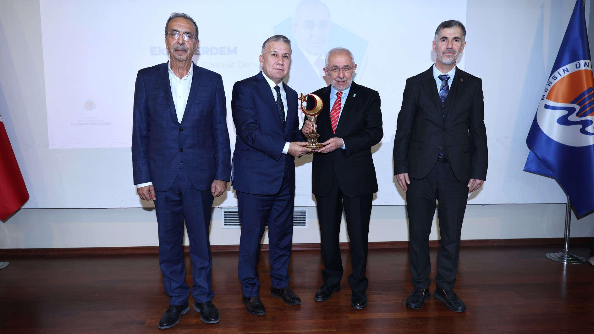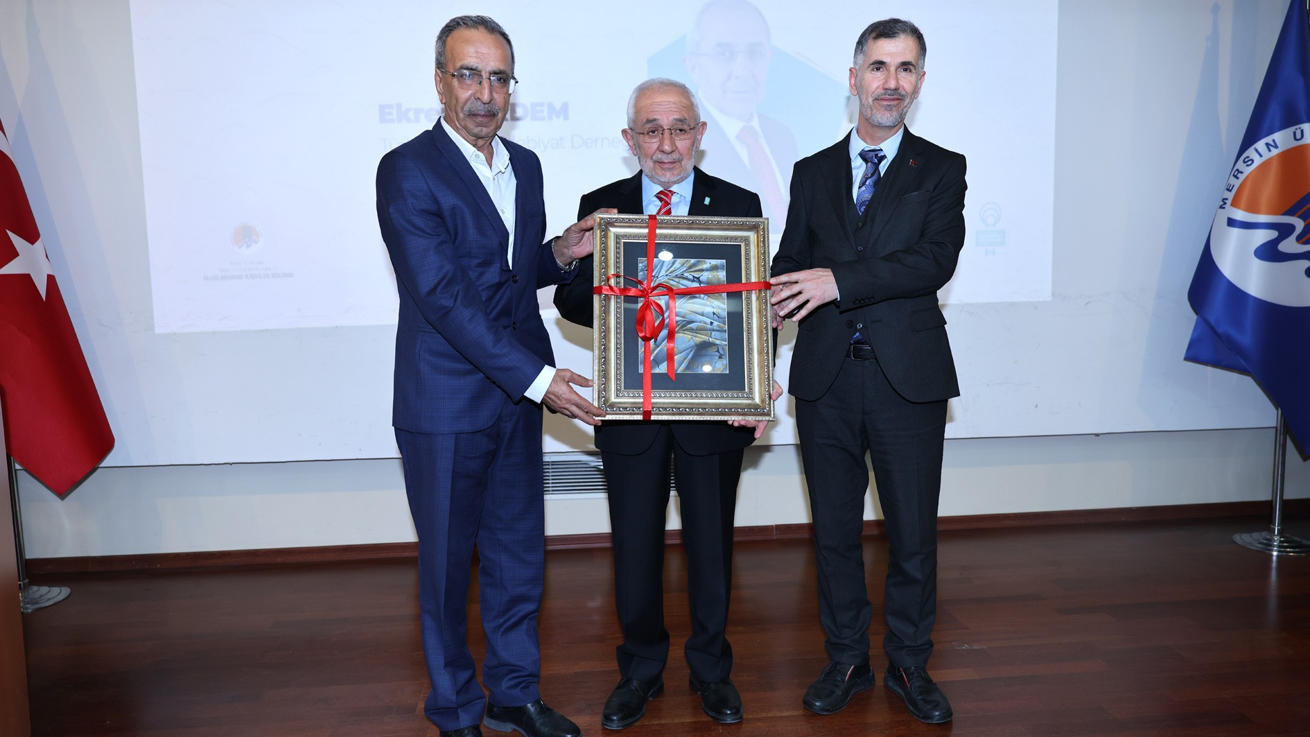 Konferans sonunda Rektörümüz Prof. Dr. Erol Yaşar ile Türkiye Dil ve Edebiyat Derneği Mersin Şubesi Kurucu Başkanı Dr. Mustafa Erim ve Türkiye Dil ve Edebiyat Derneği Mersin Şubesi Başkanı Muharrem Köse, Ekrem Erdem’e günün anısına hediye takdim etti. Program, toplu fotoğraf çekimi ile sona erdi.