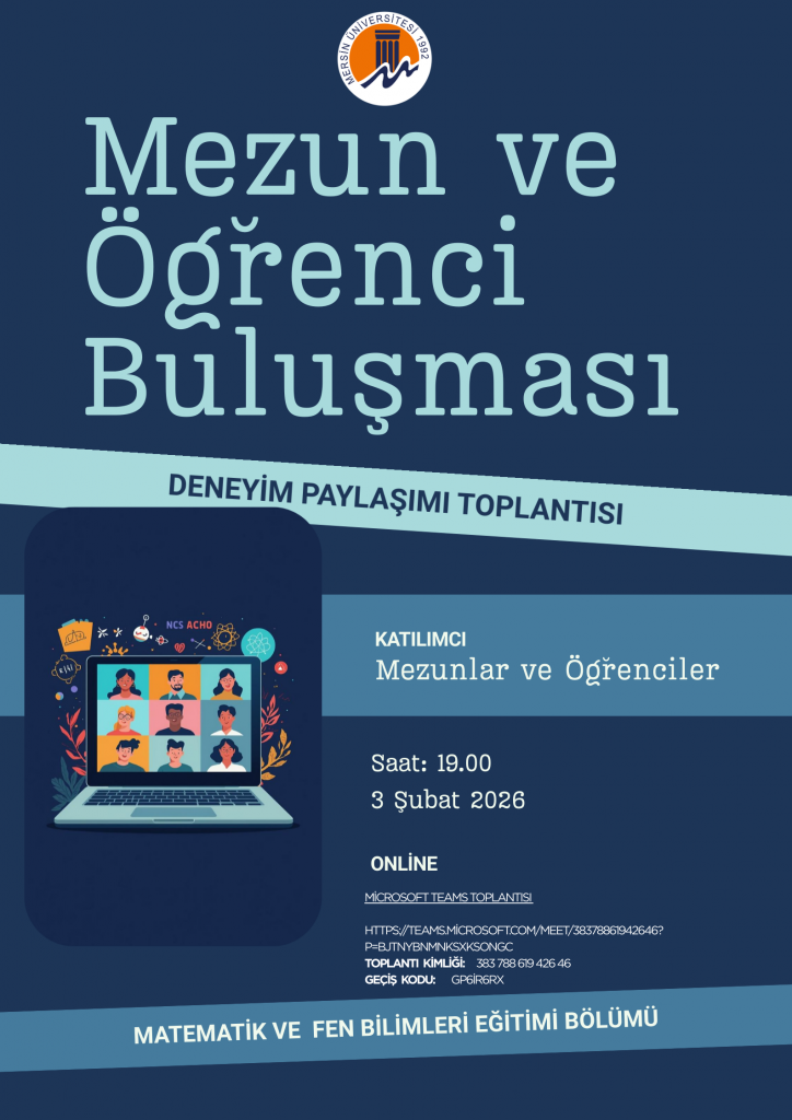 Mersin Üniversitesi Matematik ve Fen Bilimleri Eğitimi Bölümü tarafından düzenlenen "Mezun ve Öğrenci Buluşması", bölüm mezunları ile halihazırda öğrenim gören öğrencileri çevrim içi ortamda bir araya getirdi. 3 Şubat 2026 tarihinde çevrimiçi olarak gerçekleştirilen "Deneyim Paylaşımı Toplantısı" kapsamında, mezunlarımızın çalışma hayatındaki tecrübelerini öğrencilerimize aktararak onlara mesleki hazırlık sürecinde rehberlik etmeleri amaçlandı.