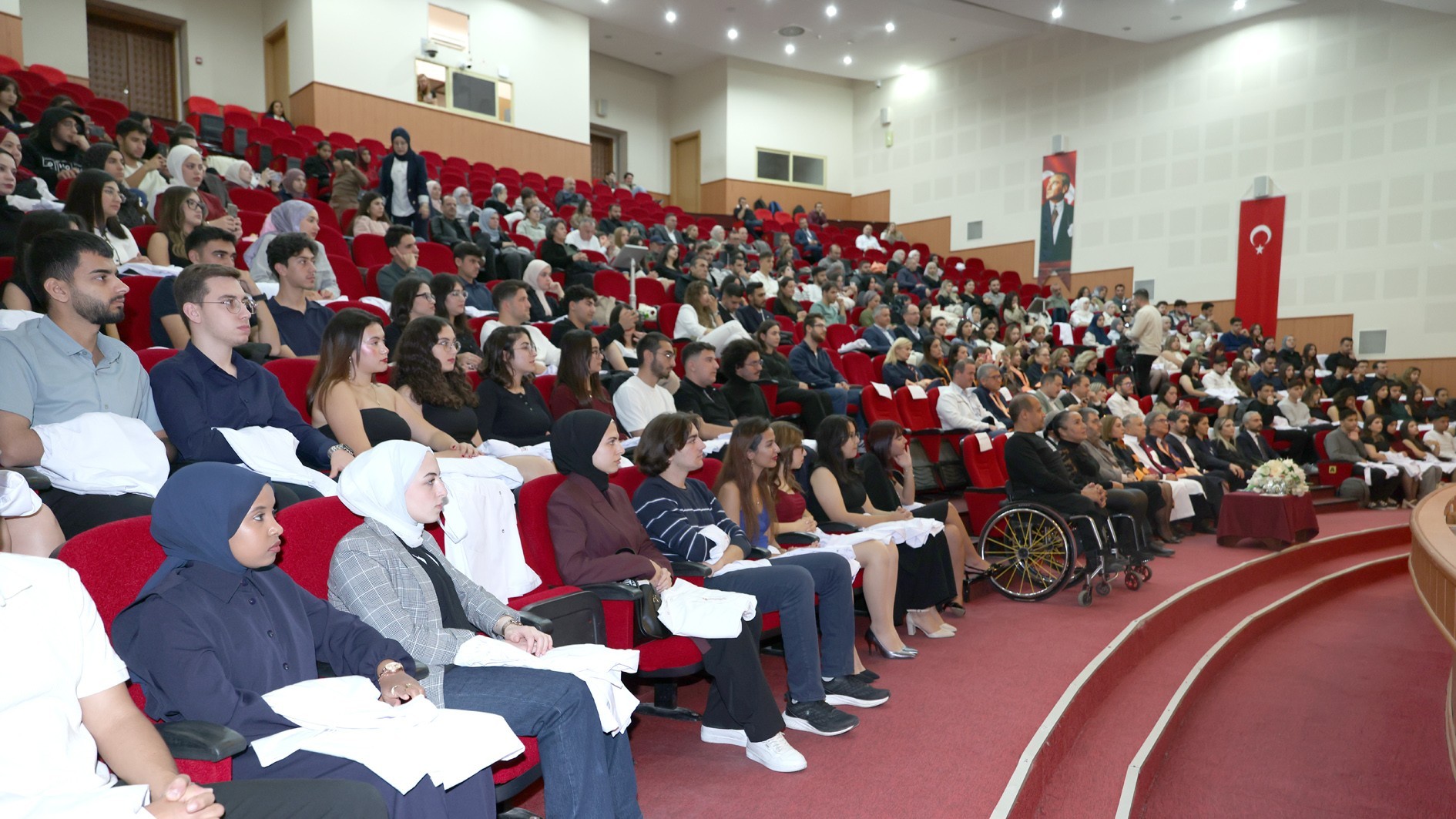 Konuşmaların ardından protokol üyeleri, akademik personel ve mezunlar tarafından öğrencilere beyaz önlükleri giydirildi. Tören, toplu fotoğraf çekimiyle sona erdi.