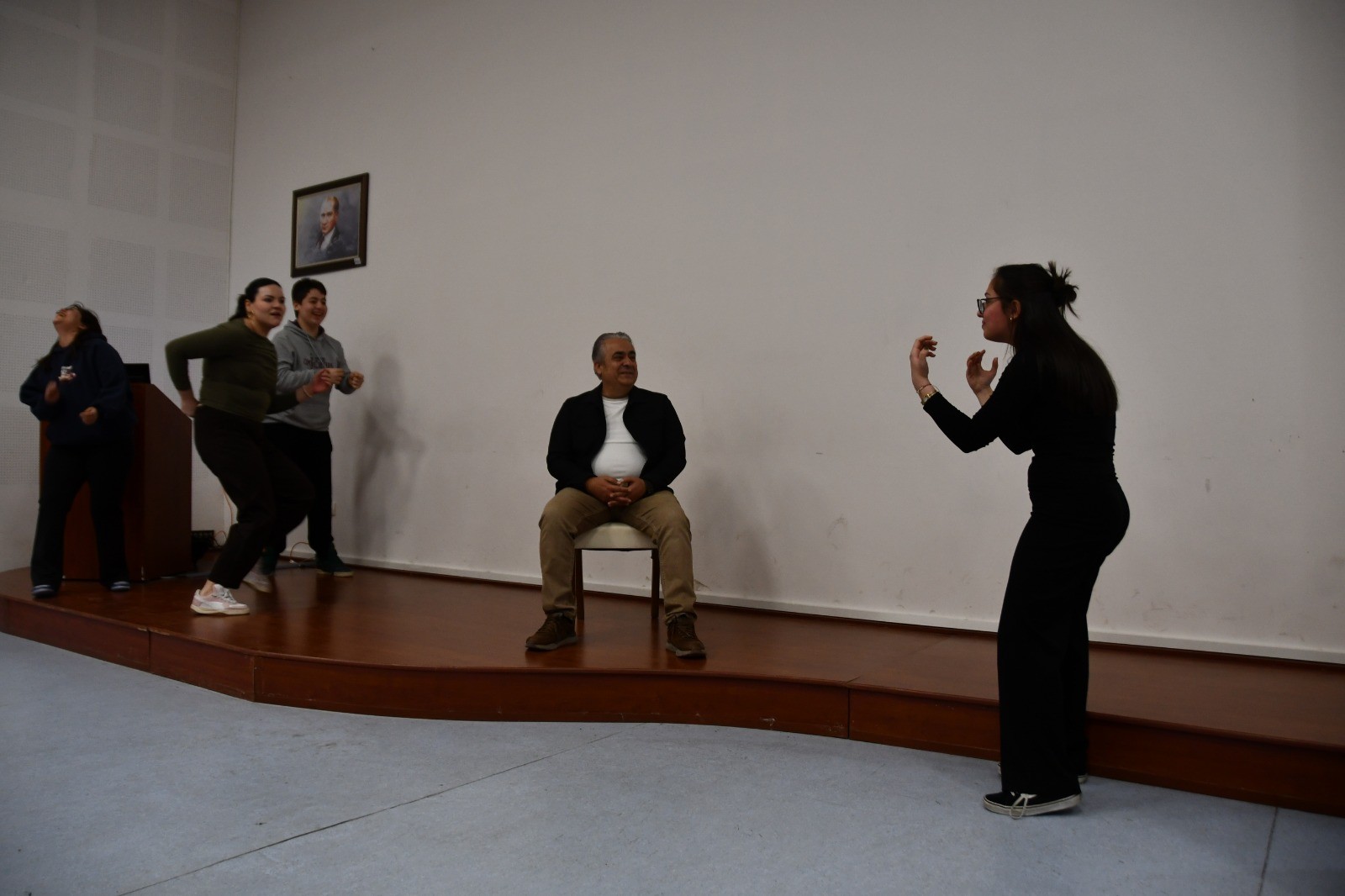 Öğretim üyeleri ve öğrencilerin yoğun ilgi gösterdiği etkinlikte, salonda neşeli ve keyifli anlar yaşandı. Katılımcılar hem tiyatro performansını izleme hem de doğaçlama sahnelere dahil olma fırsatı buldu.