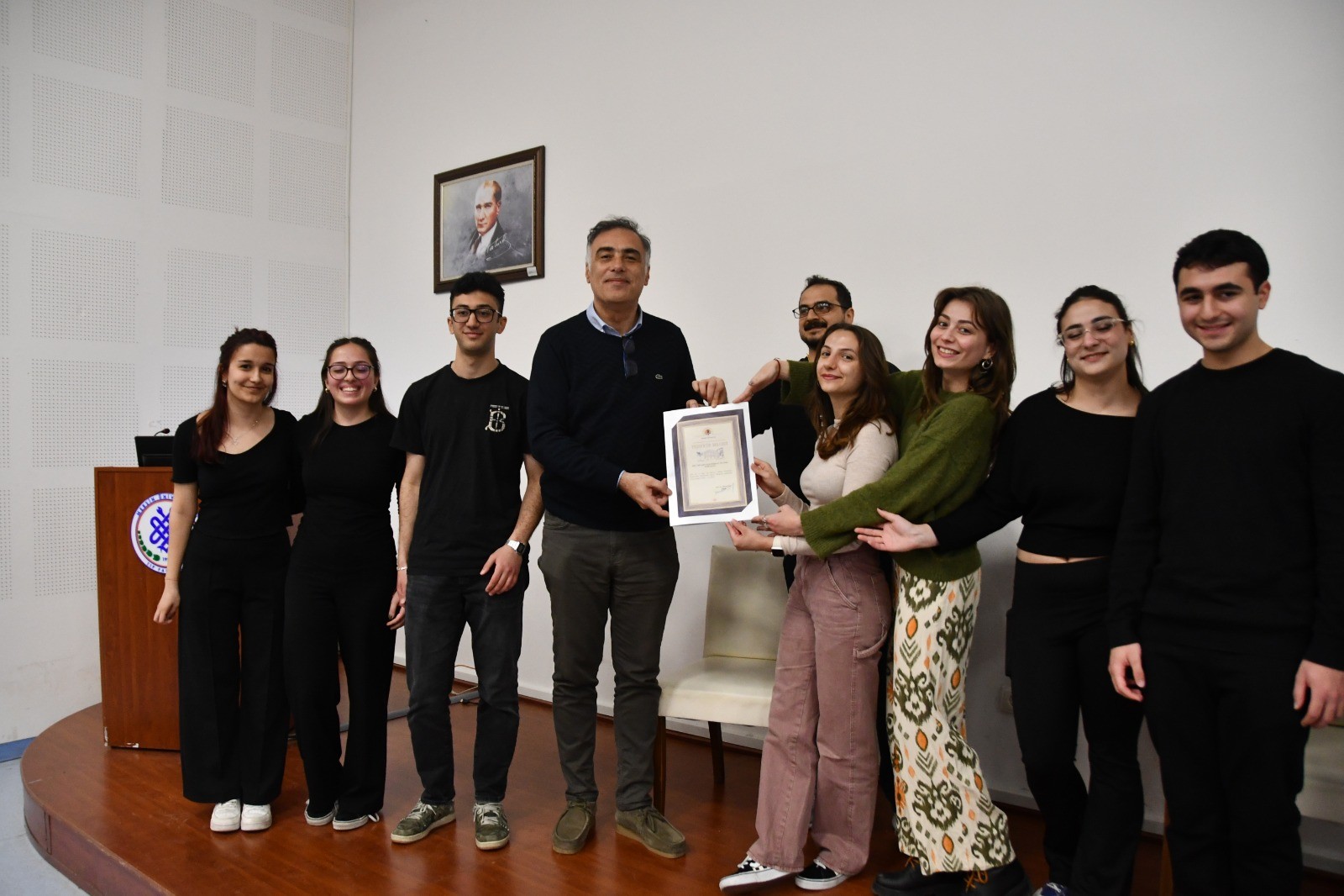 Programın ardından Sanat Topluluğu Tiyatro Kolu Başkanı Aycan Aydoğan ile gösterinin yönetmenler Yusuf Canceylan ve Elif İrem Çay’a, etkinliğe sağladıkları katkılardan dolayı teşekkür belgeleri takdim edildi.