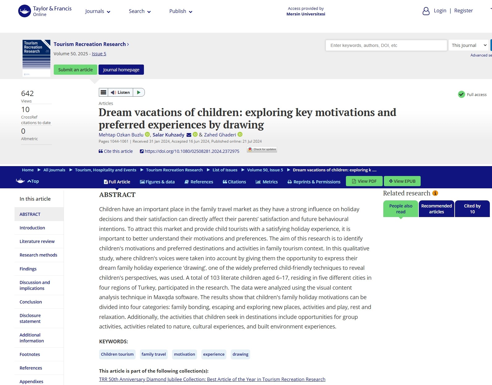 Umman Sultan Qaboos Üniversitesinden Prof. Dr. Zahed Ghaderi ve İran Kurdistan Üniversitesinden Dr. Öğr. Üyesi Salar Kuhzady’nin de ortak yazar olarak katkı sunduğu "Dream vacations of children: Exploring key motivations and preferred experiences by drawing" başlıklı makale, uluslararası bilim camiasında önemli bir yer buldu. Özgün ve çocuk dostu metodolojisiyle çocukların aile tatili motivasyonlarını doğrudan onların bakış açısından ortaya koyan çalışma, yayımlandığı günden itibaren yüksek indirme ve atıf sayılarına ulaştı. Bu yoğun ilgi, Üniversitemizin ve akademisyenlerimizin küresel çaptaki bilimsel başarısını bir kez daha kanıtladı.
