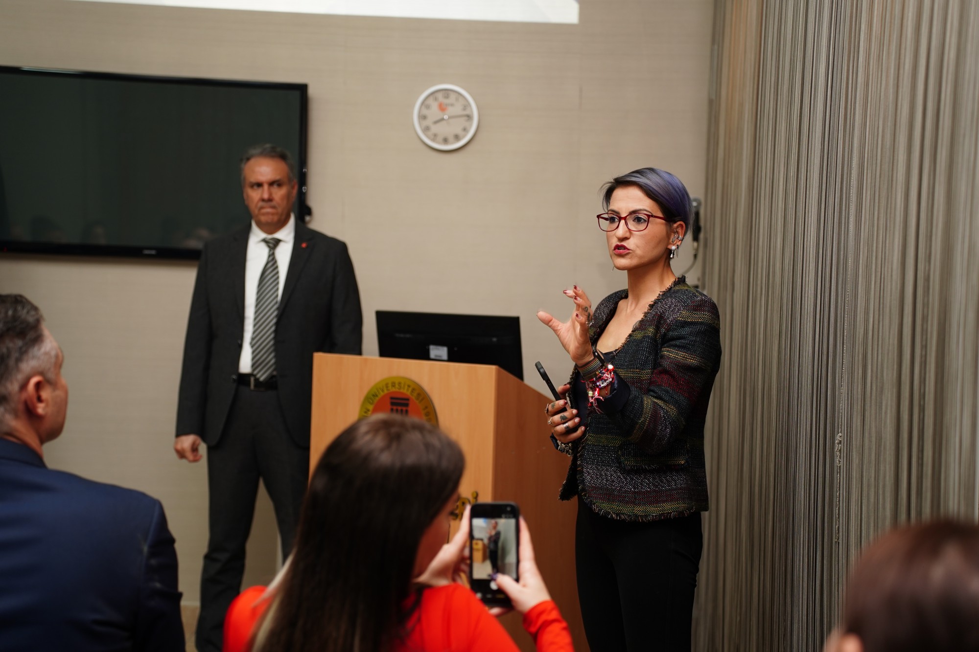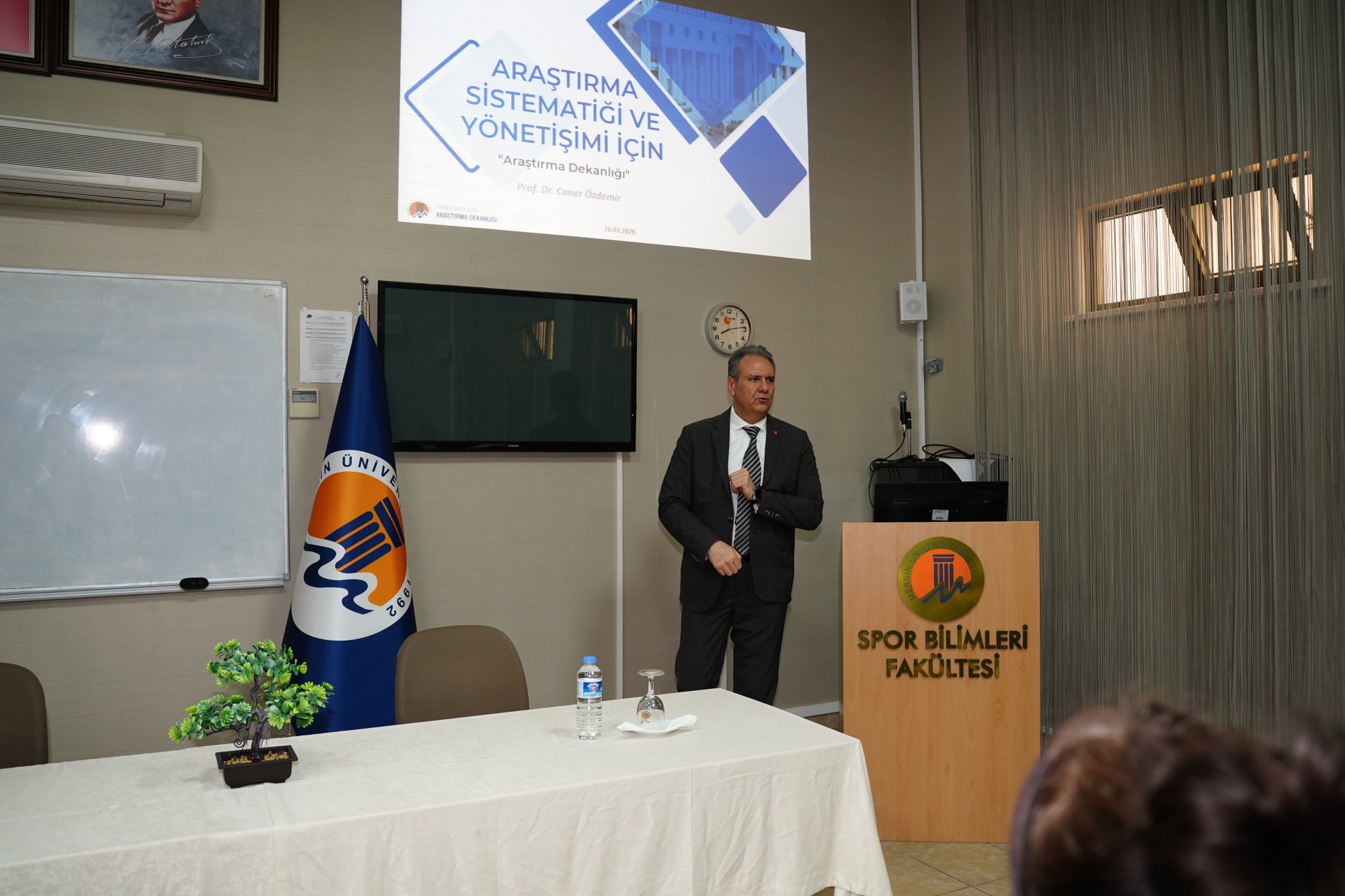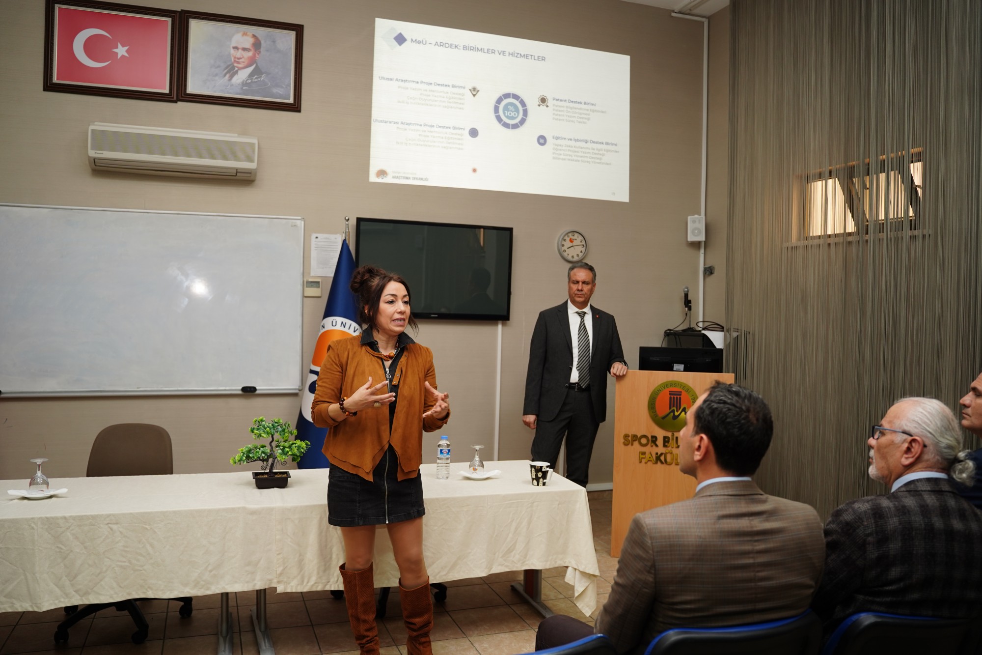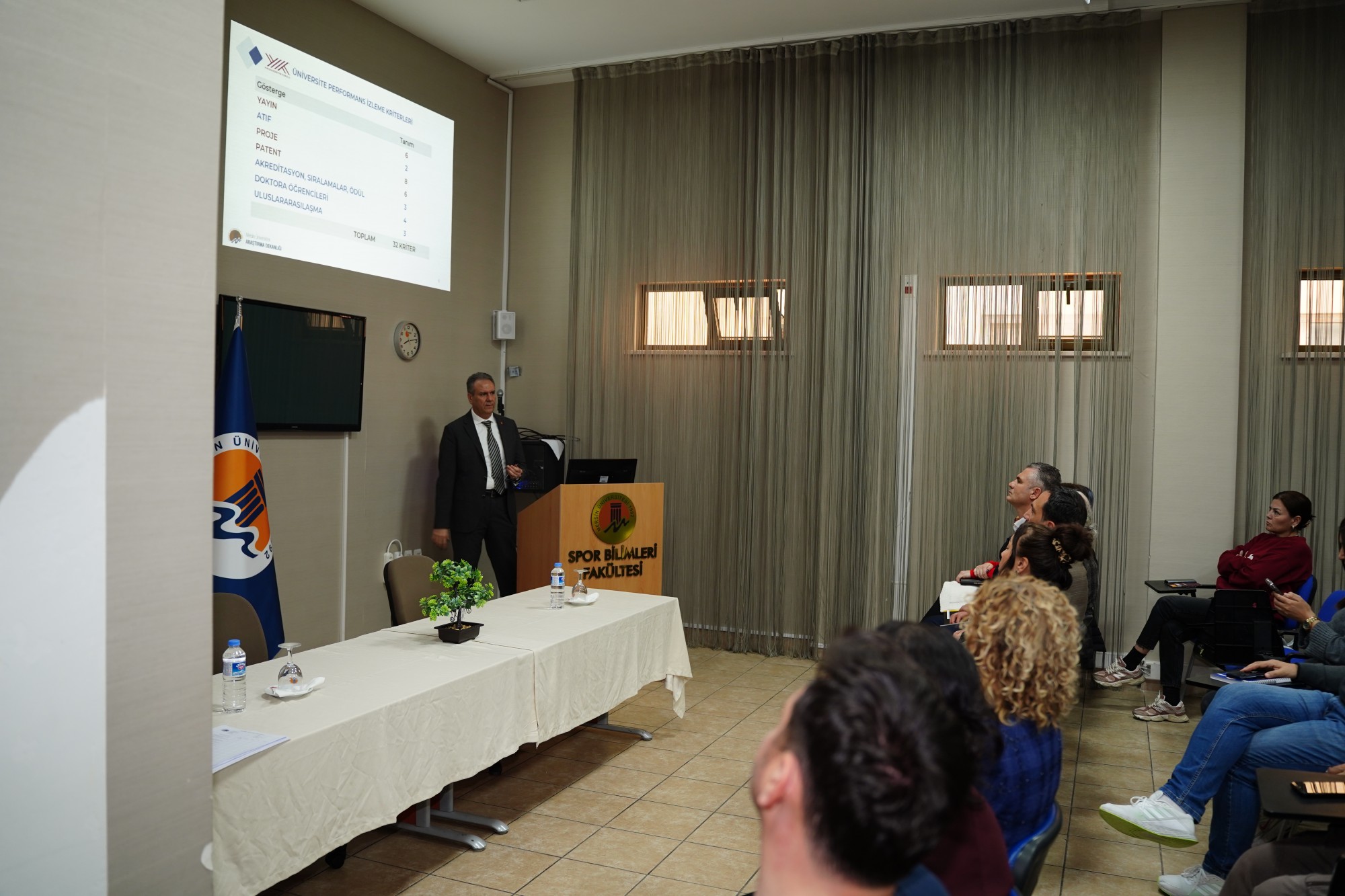 Araştırma Dekanı Prof. Dr. Caner ÖZDEMİR’in sunumuyla başlayan etkinlikte; Araştırma Dekanlığı’nın organizasyon yapısı, hizmet birimleri, ulusal ve uluslararası proje destek mekanizmaları ile araştırma ekosisteminin güçlendirilmesine yönelik stratejik hedefler paylaşıldı. Prof. Dr. Özdemir, etik değerler çerçevesinde rekabetçi bilginin tüm paydaşların katılımıyla üretilmesinin önemine vurgu yaptı. Etkinliğin devamında Spor Bilimleri Fakültesi’nin makale, bildiri ve proje performansları ile yayın–atıf göstergelerine ilişkin güncel veriler sunuldu. Sunumda ayrıca TÜBİTAK projeleri ve patent başvuru/tescil durumları değerlendirilerek fakültenin araştırma çıktılarındaki gelişim ortaya konuldu.