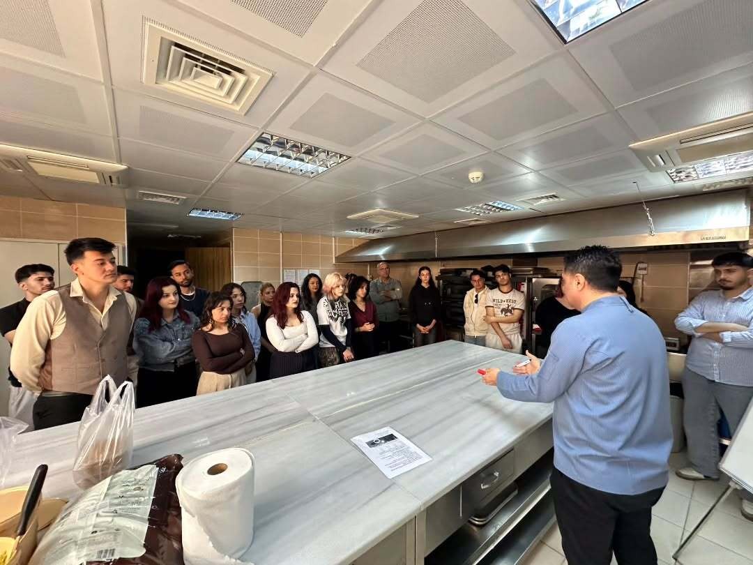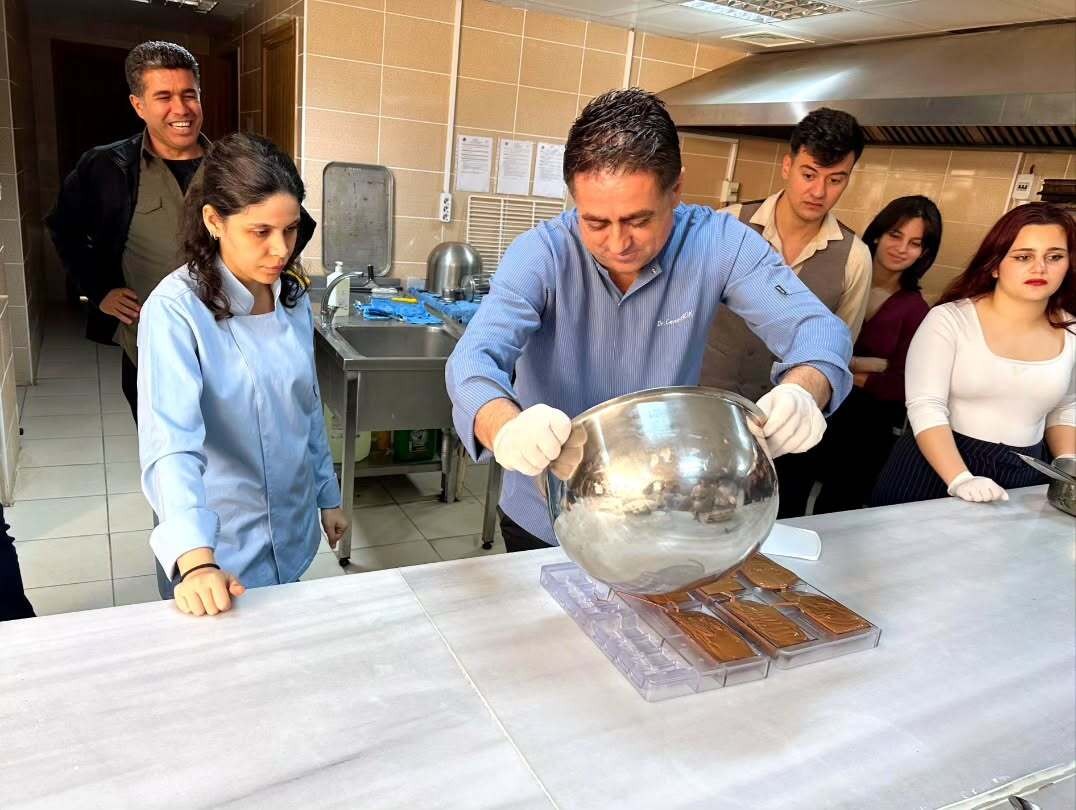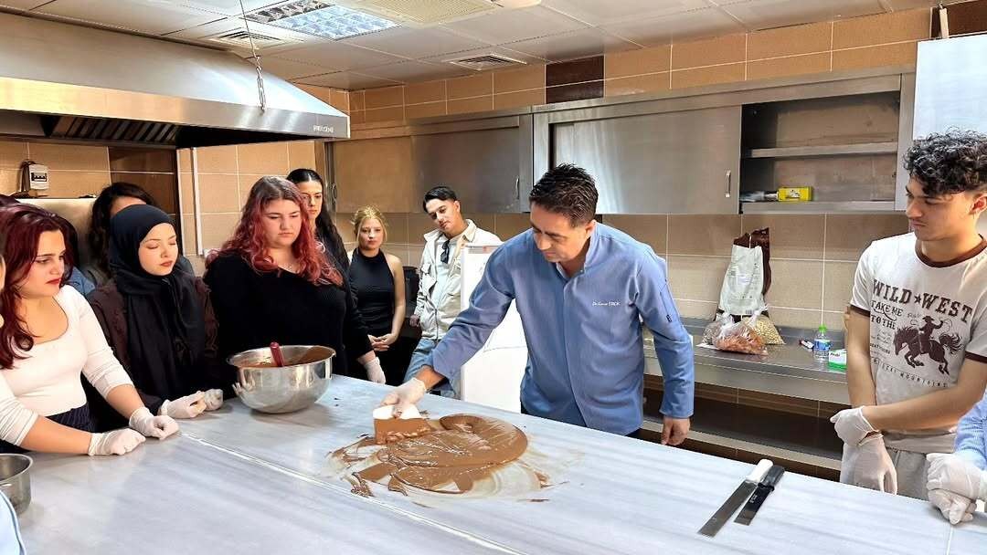 Mersin Üniversitesi Sosyal Bilimler Meslek Yüksekokulu Turizm ve Otel İşletmeciliği Programı öğrencileri, 25 Mayıs 2025 tarihinde uygulamalı eğitimi destekleyen verimli bir etkinliğe katıldı. Bölüm Başkanı Öğr. Gör. Dr. Murat Özdamar ile birlikte Öğr. Gör. Dr. Yunus Doğan ve Öğr. Gör. İbrahim Çakan’ın eşliğinde gerçekleştirilen etkinlikte, Turizm Fakültesi Gastronomi ve Mutfak Sanatları bölümü öğretim üyesi ve aynı zamanda Sosyal Bilimler Meslek Yüksekokulu Müdürü Doç. Dr. Cevat Ercik tarafından “Çikolata Yapımı ve Yapımda İzlenmesi Gerekenler” başlıklı bir workshop düzenlendi.