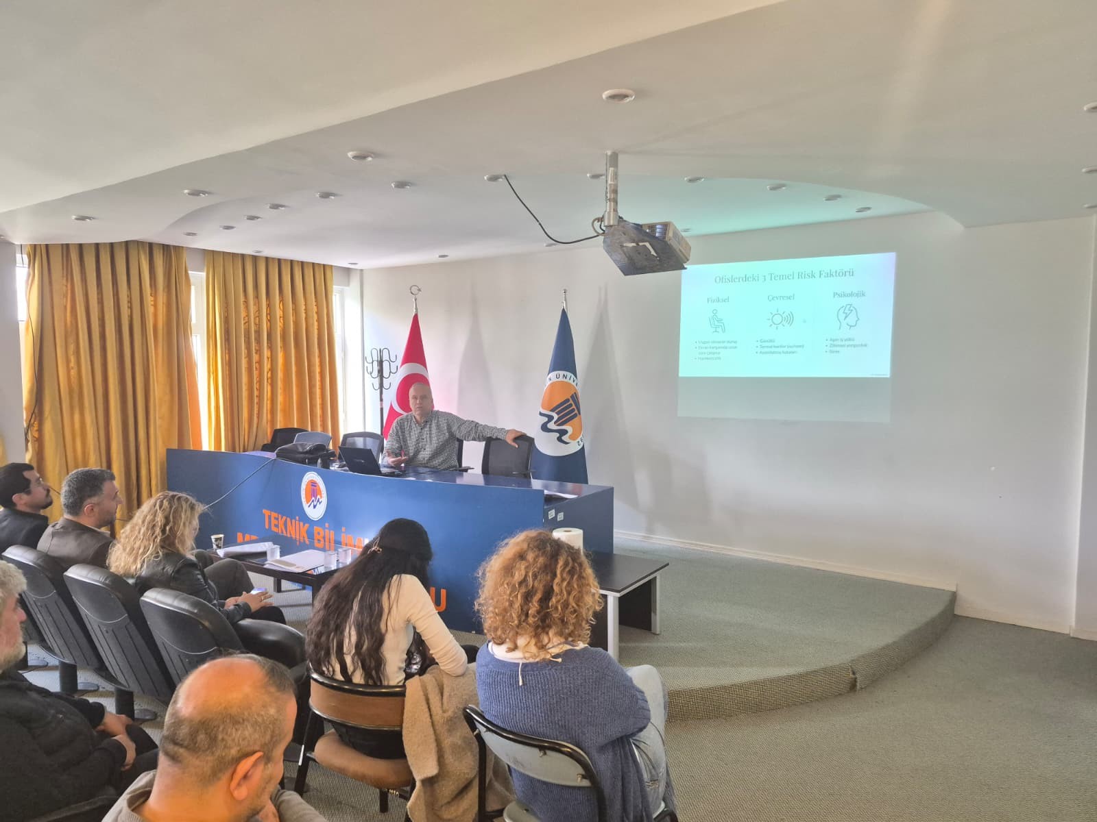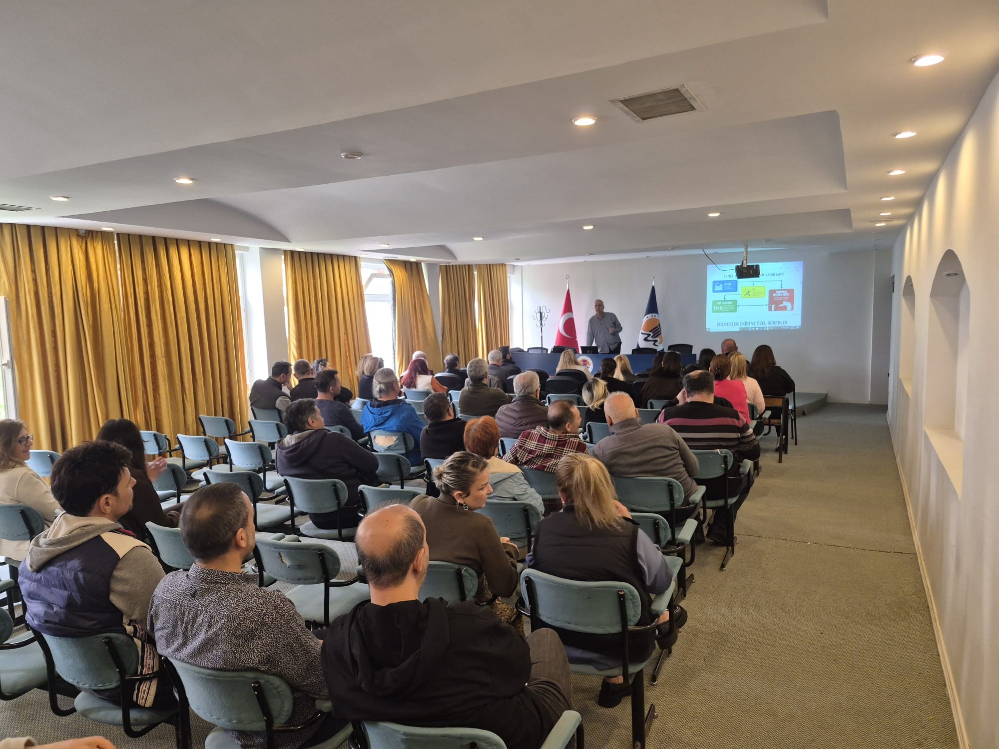 Meslek Yüksekokulumuz personelinin iş sağlığı ve güvenliği konularında bilgilendirilmesi ve yasal mevzuat kapsamında gerekli eğitimlerin verilmesi amacıyla, 6331 sayılı İş Sağlığı ve Güvenliği Kanunu’nun 17’nci maddesi ile Çalışanların İş Sağlığı ve Güvenliği Eğitimlerinin Usul ve Esasları Hakkında Yönetmelik hükümleri doğrultusunda, 03 Nisan 2026 ve 08 Nisan 2026 tarihlerinde Meslek Yüksekokulumuz Konferans Salonu’nda İş Sağlığı ve Güvenliği Eğitimi düzenlenmiştir.