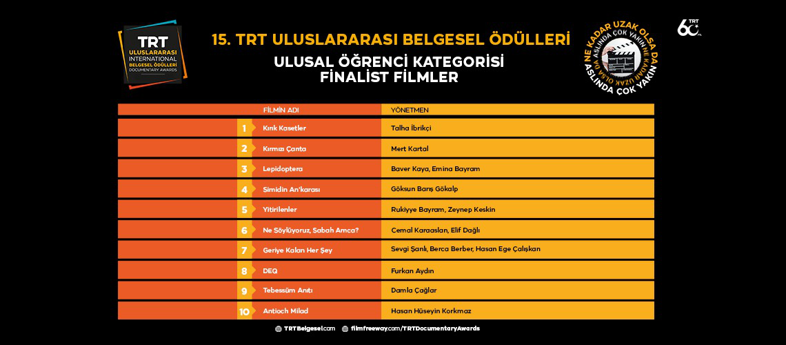 15. TRT Uluslararası Belgesel Ödülleri’nin Ulusal Öğrenci Filmleri kategorisinde finalistler açıklandı. Mersin Üniversitesi İletişim Fakültesi mezunları Baver Kaya ve Emina Bayram, yönetmenliğini üstlendikleri Lepidoptera adlı belgesel ile finale